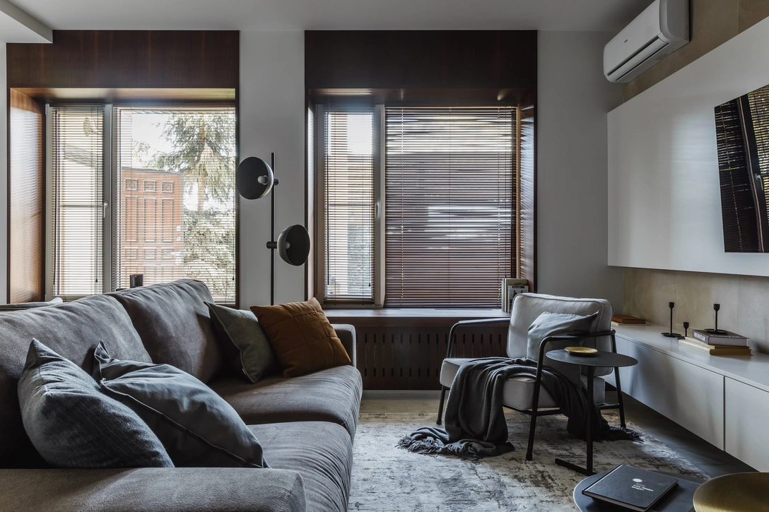 Заказчик — молодой человек с современными взглядами на жизнь. Основным его пожеланием было создание уютного пространства для комфортного проживания семьи в будущем. Вместе с тем было важно придать интерьеру свой особенный характер. В основе интерьера дома — игра различных фактур и материалов в близких друг к другу теплых тонах; дерева, камня, гладкой покраски, металла и выразительных деталей из темного орехового шпона, глубоких оттенков антрацита и структурного керамогранита.
