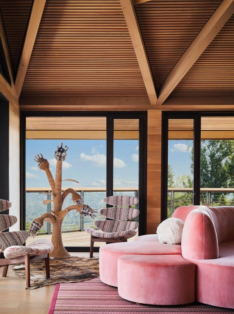 В главном доме расположились просторная кухня-гостиная, четыре комнаты и три ванных. В просторной открытой кухне-гостиной семья проводит больше всего времени — это сердце дома. Декор, цветовая палитра и округлые формы мебели напоминают эстетику шестидесятых. С розовым полукруглым диваном в бархатной обивке «рифмуется» замысловатая люстра из розового металла. Реечный потолок из светлого дерева создает особый уют и тепло.
