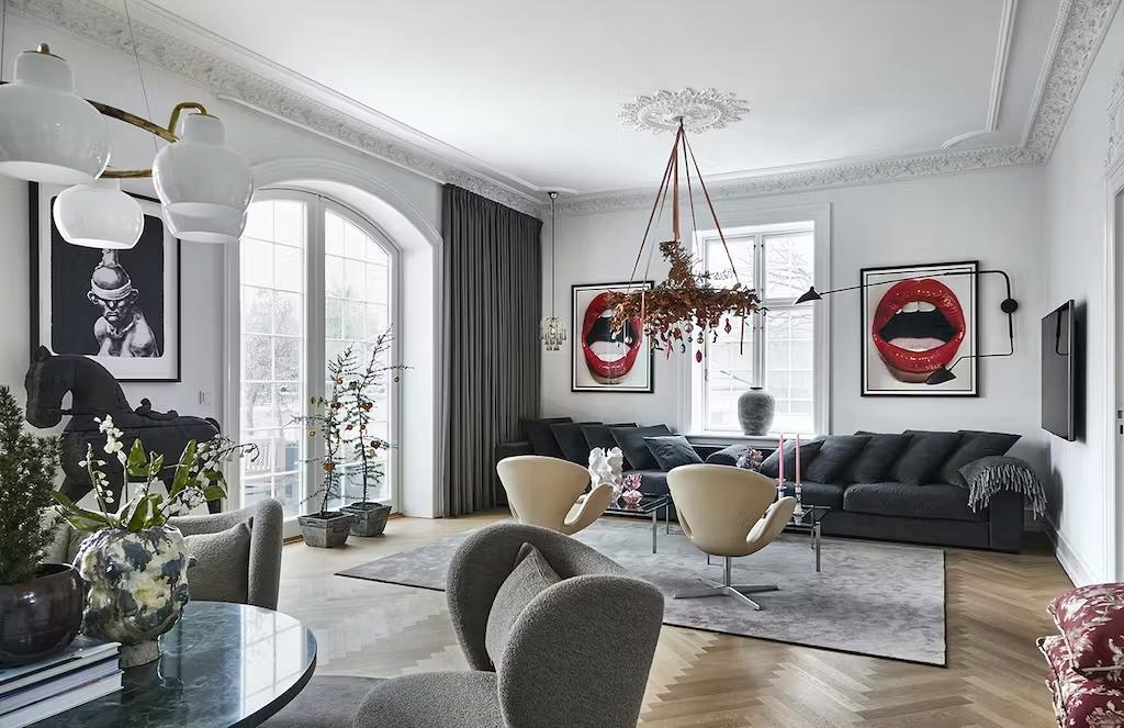 Кристина Визинг-Шварц с мужем и двумя детьми живут в Фредериксберге, в доме 1900 года, который в 2019 году они отремонтировали — и это был первый ремонт за семьдесят лет. Особенно остро нуждались в ремонте кухня и столовая — сейчас это одна комната, любимая всей семьей, с большим открытым пространством, наполненным естественным светом и утром, и днем. Именно здесь семья проводит большую часть времени в рождественские дни.