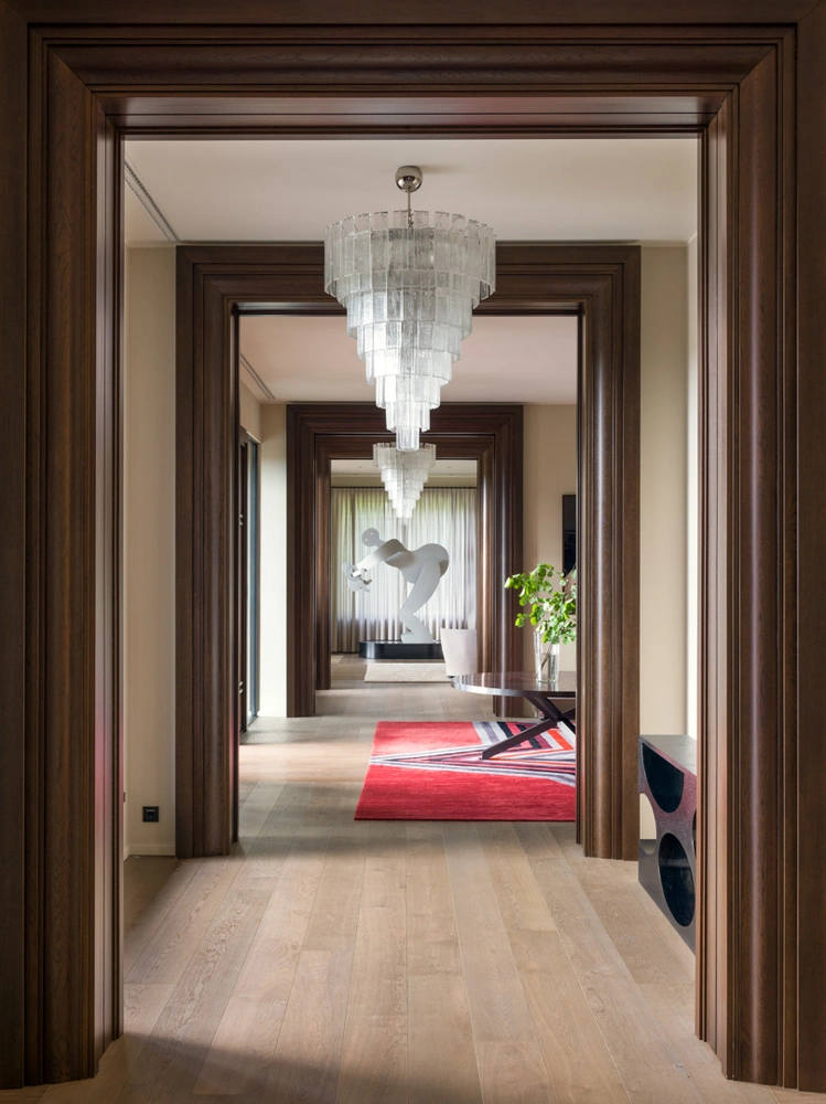 Монументальный подход архитектора подчеркнул строгий стиль самой анфилады и грандиозного лестничного холла, напоминающих залы музейных зданий. Высота потолков в гостиной — чуть менее семи метров, но крупноформатные картины художников Anastasia и Владимира Дубосарского и Александра Виноградова гармонизируют пространство, делая его соразмерным человеку.