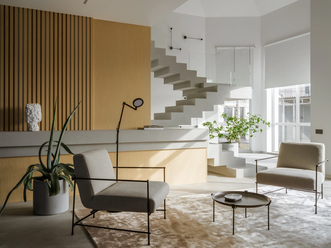 «На первом этаже основной и самой сложной задачей было обновить лестницу. Изначально она представляла собой тяжеловесную монолитную конструкцию с такими же монолитными перилами. Чтобы сделать ее более легкой, мы решили отказаться от перил и оставить только стеклянные ограждения в верхней части. Металлическая конструкция, на которой держатся ступени, зашита в стену, за счет этого мы смогли обойтись без единой видимой опоры».