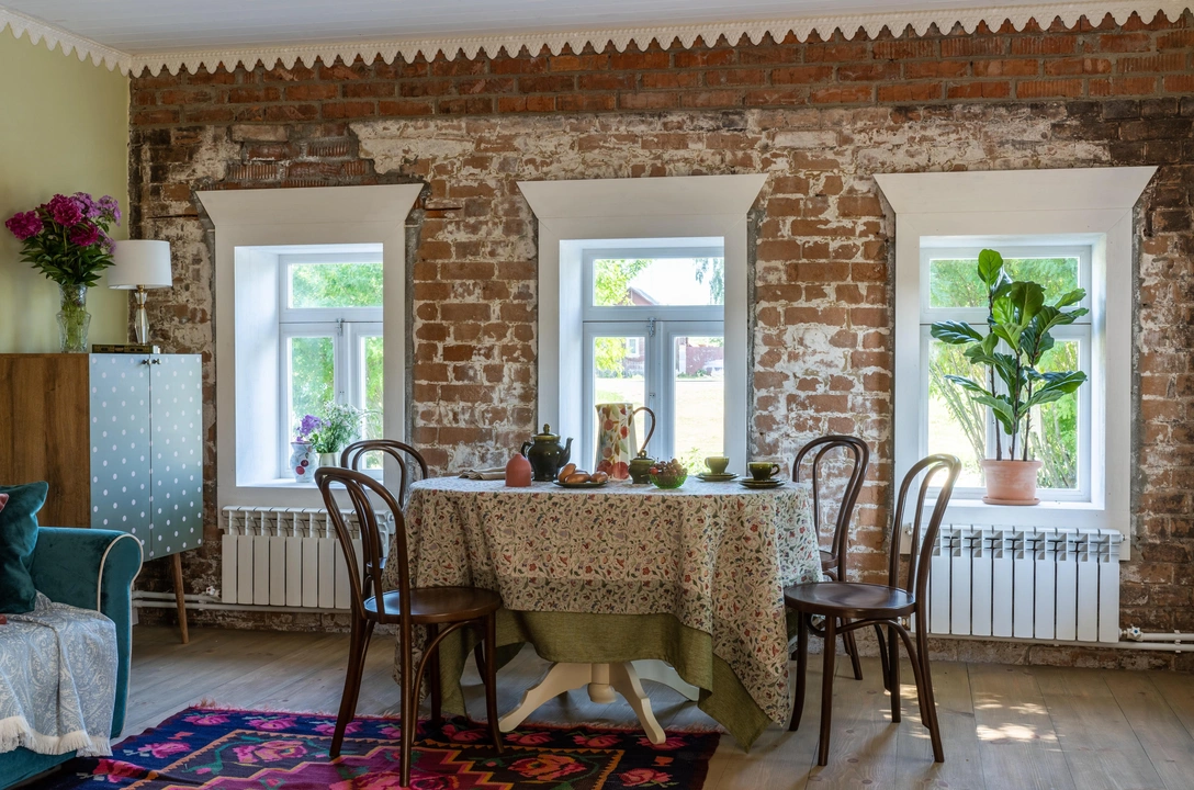 «Весь интерьер построен на контрастах цветов, фактур и стилей. Например, гипсовая лепнина и хрустальные люстры органично смотрятся на фоне простого дощатого потолка. Кирпичную стену главного фасада решили оставить как есть: только изготовили новые наличники на окна и слегка подкрасили кисточкой швы новой кладки, которую мы добавили при реставрации. Еще одной изюминкой проекта стала настоящая русская печка. Она украшена гипсовыми панелями, которые вручную изготовил местный мастер».