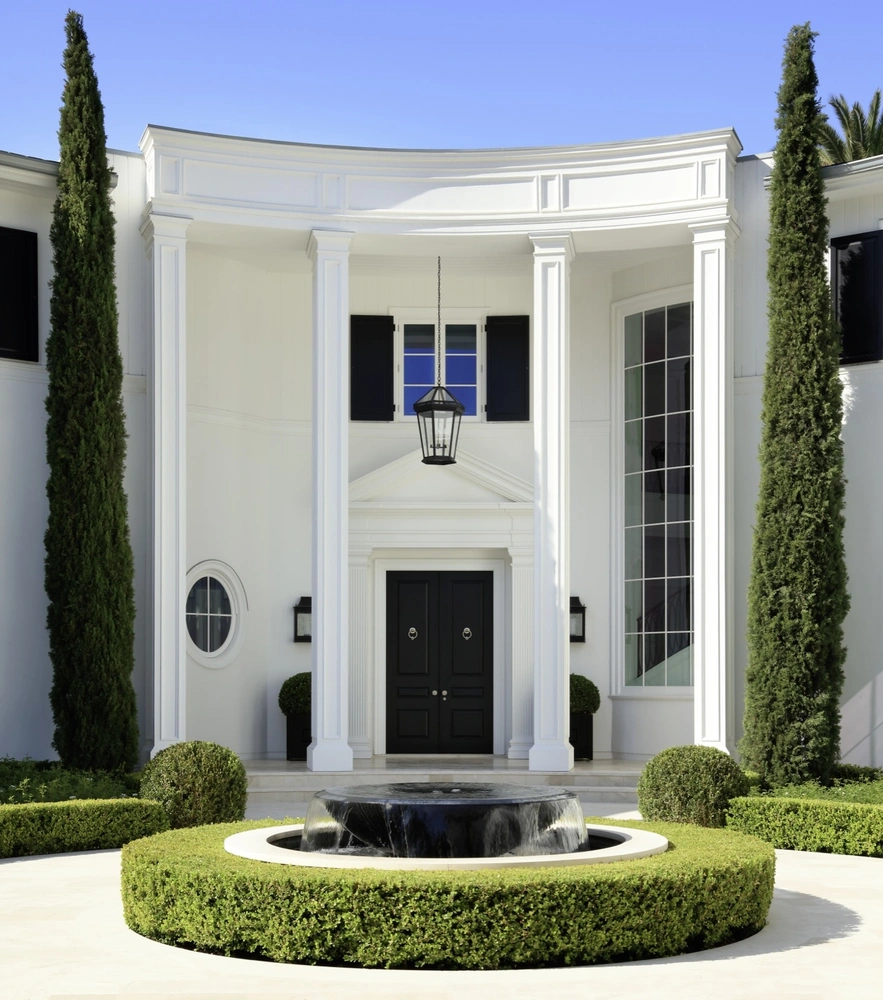 Белая гипсовая лепнина, полы из черного и белого мрамора — все эти детали позволяют прошлому звучать в настоящем. «Я хотел, чтобы вместе с изменениями, которые мы привнесем, дом не потерял свою связь с историей. Круглый портал с колоннами на входе и новый черный фонтан перед ним — настоящий голливудский гламур!»