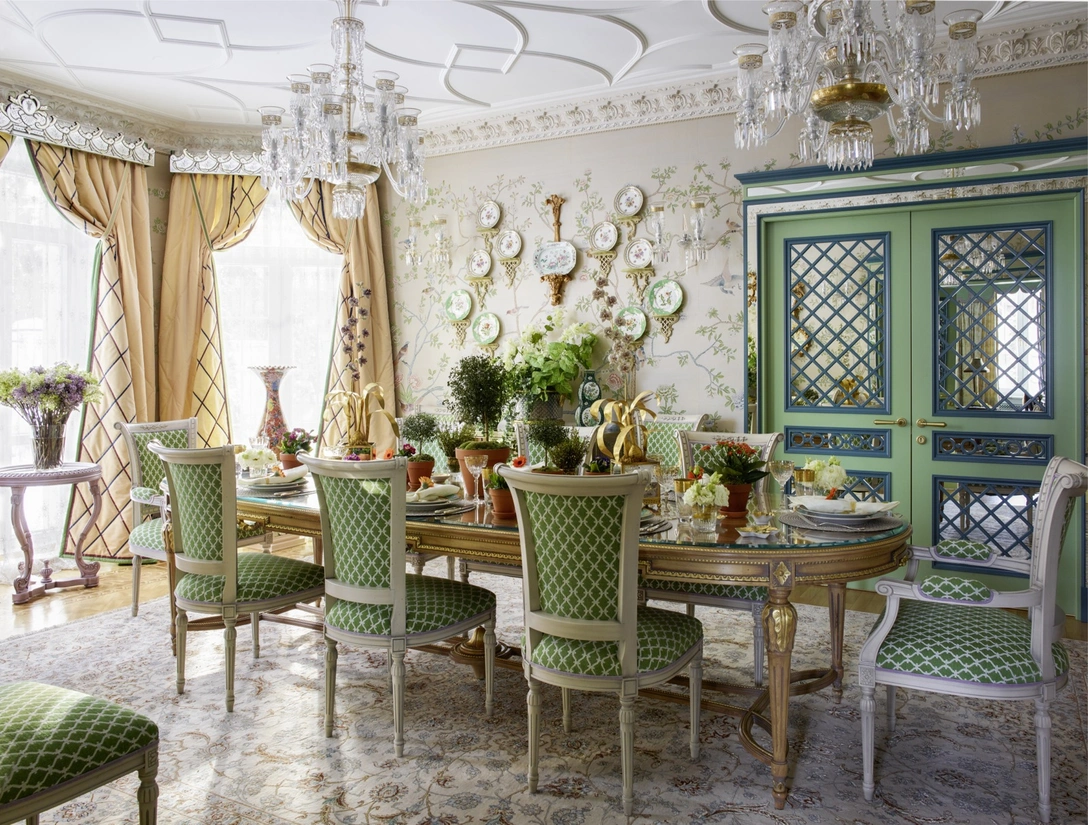 «Столовая замыкается эркером, поэтому декор окон стал основным акцентом помещения. Шторы выполнены из шелка светло-персикового цвета с широким стеганым кантом из накладных лент сливового и темно-синего цвета. Подхваты расположены высоко, чтобы в комнату проникало больше естественного света. Подкладка на левой и правой шторах выполнена из разных оттенков зеленого шелка: на правом полотне с темно-зеленой подкладкой подхват светло-зеленого цвета; на левом полотне подкладка светло-зеленая, а подхват — темно-зеленый».