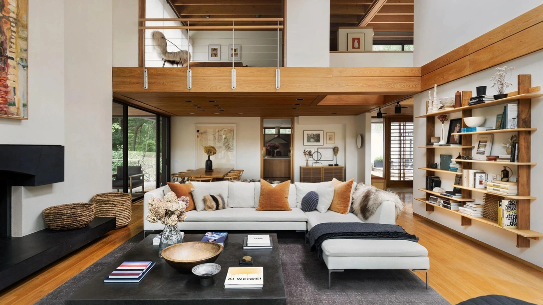 В оформлении дизайнеры отдали предпочтение стилю джапанди, в который органично вписывают оригинальные деревянные полы, потолочные балки и столярные изделия. Палитра землистых оттенков и природные текстуры дополняют лесные пейзажи, которые открываются из панорамных окон.