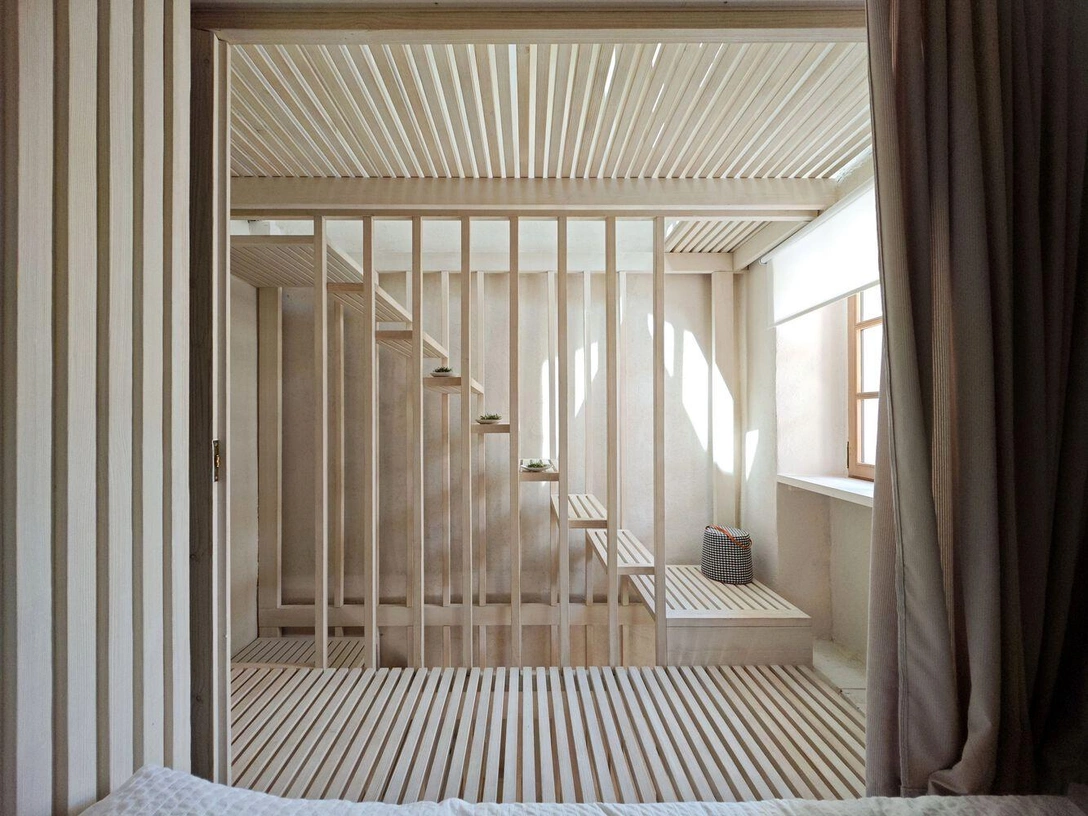Чтобы обеспечить уединение, на каждом этаже есть ниша с зоной отдыха или кроватью, которую можно закрыть шторами. На кухне зоны встроенного хранения окружают центральный остров.
