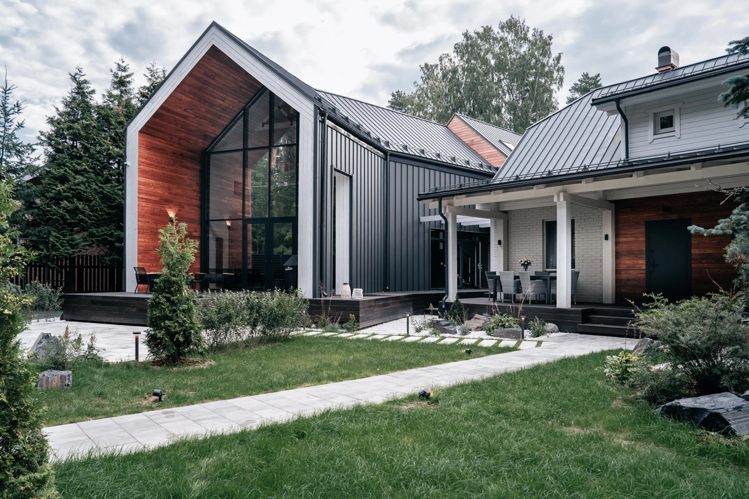 «Изначально заказчик хотел просто построить отдельный дом рядом с существующим. Но мы решили все таки поставить более сложную задачу и предложили превратить оба дома в один архитектурный объем, соединив их переходом. По стилю здания совершенно разные. Чтобы они выглядели более гармонично, мы покрыли крышу старого дома фальцевой кровлей, красный кирпич выкрасили в дымчато-белый оттенок и добавили элементы термодерева на фасад».