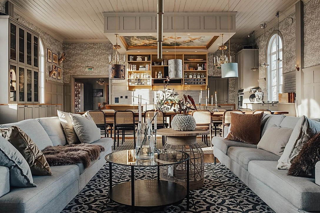 Сердце дома — главный обеденный зал с высоким расписным потолком и уютной, домашней обстановкой, это «епархия» Никласа, где он готовит блюда для посетителей и проводит «заседания» своей кулинарной студии. Эта же зона служит общей гостиной: в ней есть комфортный уголок с мягкими диванами и зоной отдыха.