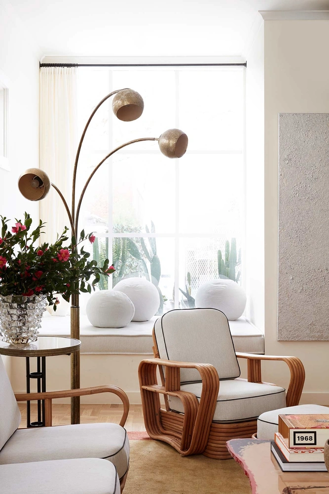 Столовая ведет к просторной гостиной, расположенной чуть ниже уровнем. Тамсин украсила портал современного камина облицовкой из каменной плитки Palladiana в стиле 1950-х по дизайну студии Studiopepe и обставила комнату коллекционным винтажом. Здесь можно обнаружить вешалку для одежды Джо Понти (Gio Ponti), тростниковую мебель 1960-х годов местного производства, журнальный столик авторства Гаэтано Пеше (Gaetano Pesce), подвесной светильник Curtis Jere в стиле 1970-х, французский торшер 1930-х, винтажные бра из муранского стекла и вазы из антикварного магазина Эда Кларка и Тамсин Джонсон.