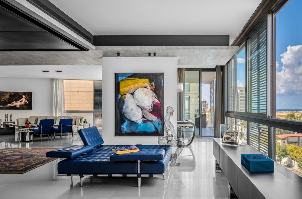 Из окон дома открываются, с одной стороны, захватывающий вид на Средиземное море и римские руины, а с другой — на полные красок улицы Бейрута. Чтобы подчеркнуть эту двойственность в интерьере, дизайнеры разбавили монохромную палитру всплесками цвета. Выразительные произведения искусства, яркие предметы мебели и эксцентричные элементы декора добавили интерьеру живости и динамики.