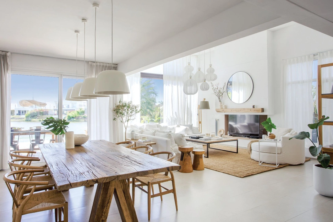 Из этих же соображений была выбрана белоснежная гамма, с которой отлично сочетается насыщенная текстура натурального дерева, плетеная мебель и ковры из сизаля. Стены выкрашены белой краской, на полах — крупная квадратная плитка бежево-молочного цвета. Добавьте к этому легкие, воздушные светильники, напоминающие облака, и живые растения, которых в интерьере немало, — и получится идеальный пляжный дом у океана, лучшее место для удаленной работы и расслабленного отдыха.