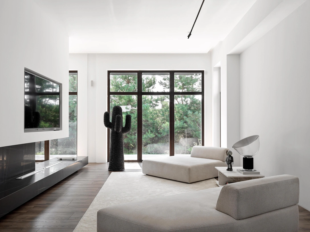 «В гостиной главная доминанта — черный кактус из лимитированной серии и подвесной камин. Вместо стандартного дивана, мы решили сделать двухсекционный с большой лежанкой».