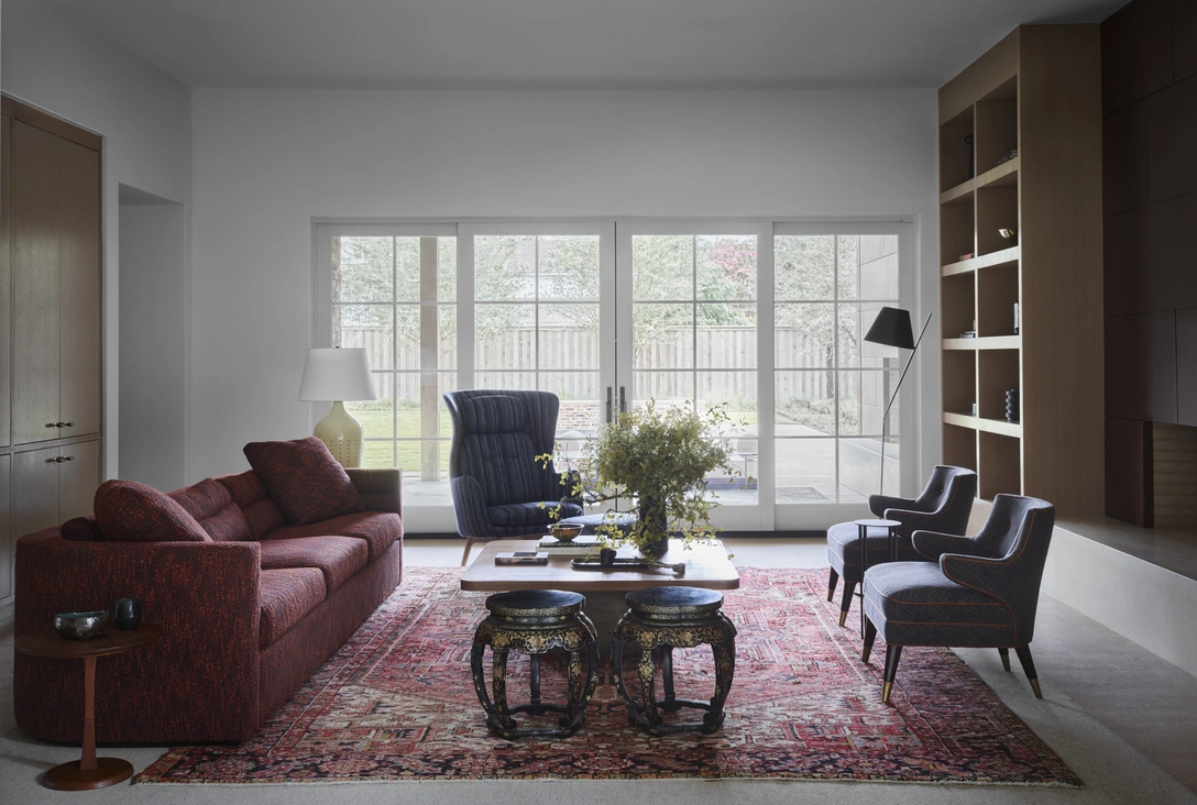 Мебель в коттедже подобрана не менее тщательно. В гостиной стеллажи из белого дуба со встроенным освещением расположены по обе стороны от камина. Диван, обитый тканью от Jiun Ho, журнальный столик ручной работы и кресло от Fritz Hansen позволяют уютно проводить время вечером в семейном кругу. Затем из гостиной можно легко переместиться на террасу, если в Далласе будет хорошая погода. Главным украшением мастер-спальни стало винтажное вращающееся кресло, выполненное по проекту Эдварда Уормли (Edward Wormley).
