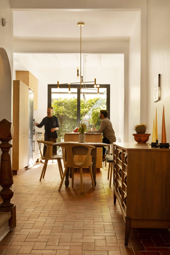 Перед хозяевами стояла нелегкая задача: обновить таунхаус викторианской эпохи, восстановив исторические детали, утраченные в ходе реконструкции 1980-х годов, привнести больше света в интерьер, при условии, что окна находятся только с двух сторон здания, а также организовать отдельный офис для встреч с заказчиками. К слову, Майкл и Матье изначально собирались отремонтировать только кухню, но «когда начали ломать, остановиться уже не смогли».