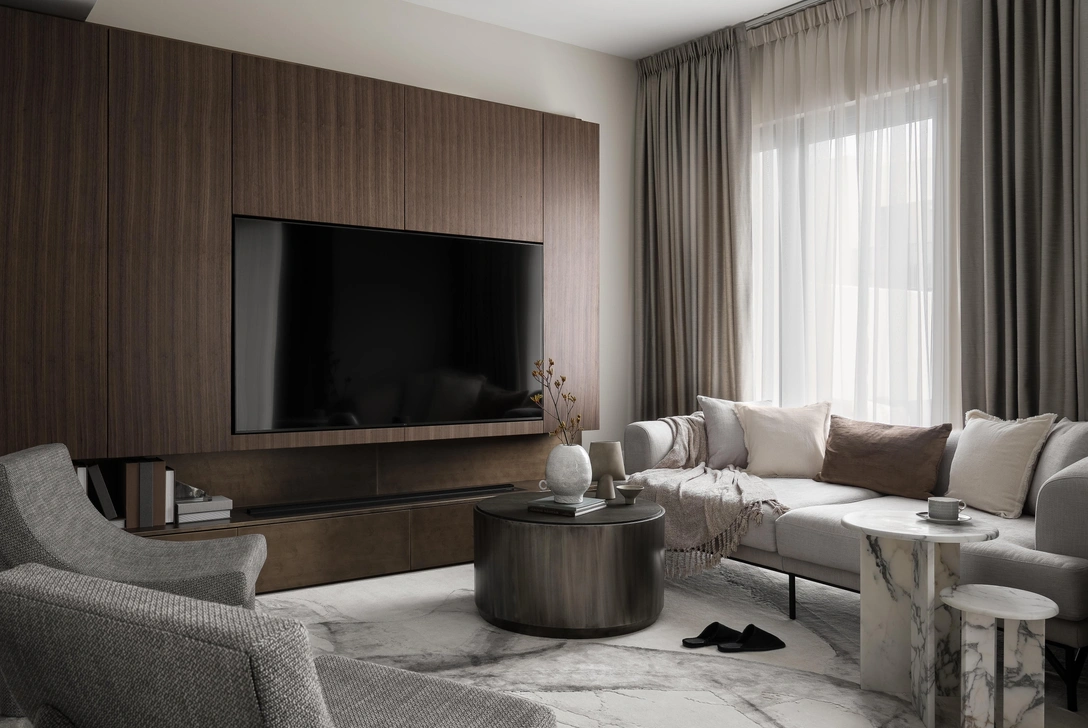 Интерьер был спроектирован для женщины, которая живет в двух городах. В Дубае она хотела создать современное пространство с восточным колоритом, интегрировать элементы местной культуры в современный интерьер. На первой встрече клиентка попросила сделать спокойную цветовую гамму с акцентами. Дизайн отражает ее яркую и жизнерадостную личность — приглушенные базовые тона в нем сочетаются с благородными глубокими цветами.