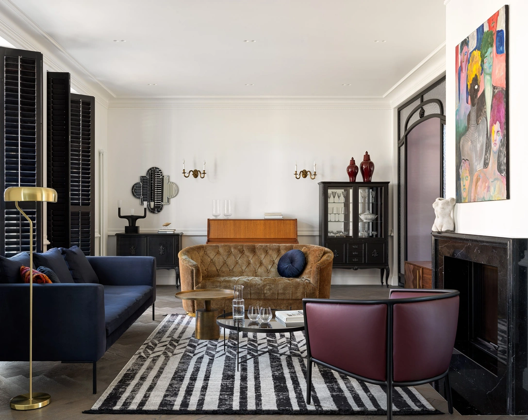 Коробка дома стояла вот уже 10 лет. Маленькие, ассиметричные окна, высокий вход, небольшие комнаты делали ее некомфортной для современной жизни. Я заменила белые пластиковые окна на черные со ставнями, внеся в них симметрию и увеличив до 2,8 метров в высоту — и эти окна стали отправной точкой для всего интерьера, задавая атмосферу старой городской Англии.