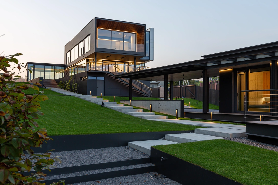 Заказчик этого проекта — молодой успешный топ-менеджер IT-компании, который хотел построить для себя современный дом с видами на участок и воду. К нему периодически приезжают родители и семья брата — для них рядом был построен гостевой дом. Заказчик был открыт новому и необычному. Он активно принимал участие в выборе материалов и обращал внимание на детали — ткани, фактуры, оттенки.