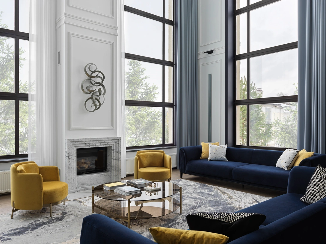 «Главным героем гостиной стал, конечно же, настоящий дровяной камин. Огромные окна дарят ощущение единения с природой, а камин привносит в пространство умиротворение и уют. Над ним мы повесили металлическое декоративное панно, которое делает пространство интереснее и выразительнее».