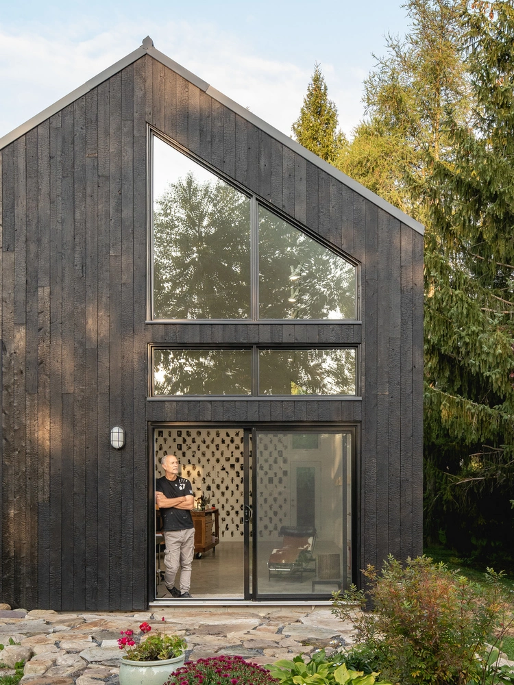 Студия получилась просторной и светлой — в ней много дневного света, который необходим художнику для работы. Полностью застекленный коридор соединяет мастерскую с основным домом. На контрасте с главным домом белого цвета, здание мастерской сделали из обожженного дерева — тем самым подчеркнув «огненную» природу творчества Стивена Спазука (ведь именно огонь является его главным инструментом). В юго-западном фасаде сделан длинное и узкое окно, через которое можно ловить последние лучи вечернего солнца.