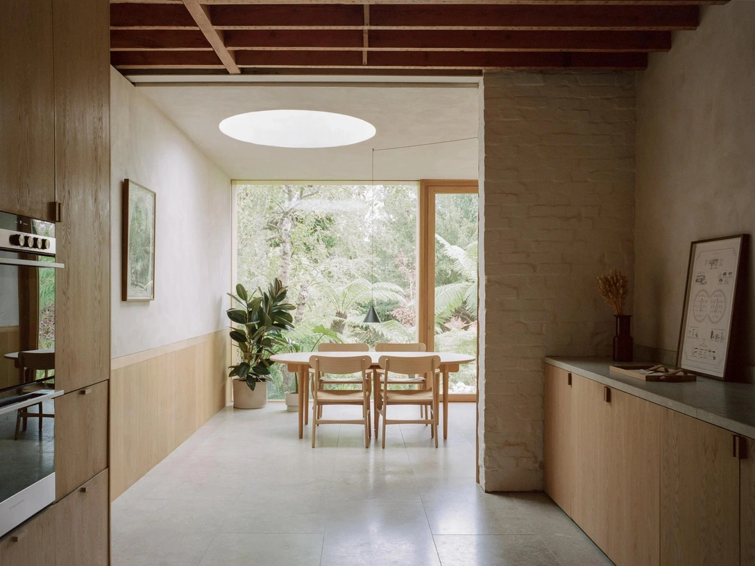 Масштаб работ по перестройке и ремонту дома был немалым, но Ридли и его команда старались уменьшить их негативное влияние на окружающую среду и сделать проект максимально экологичным и «устойчивым». Так, например, в зоне кухне на первом этаже были сохранены и восстановлены стены из каменной кладки — архитекторам не пришлось возводить новые и тратить на это энергию и материалы. Также они оставили открытыми оригинальные потолочные балки, которые напоминают о богатой истории дома.