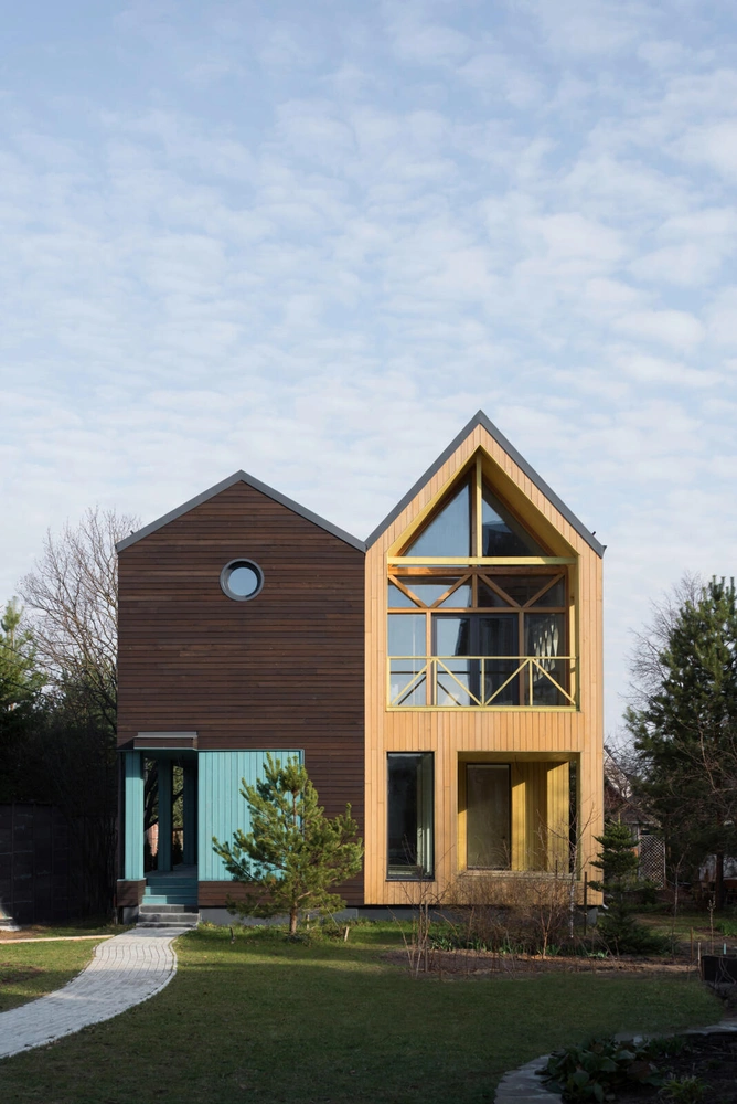 Архитекторы Сергей Колчин, Антон Архипов и Надежда Торшина спроектировали необычный деревянный дом, который словно отпочковался от стоящей на этом же участке академической дачи. «В старом доме живут родители наших клиентов — пары предпринимателей с двумя детьми, — рассказывает Сергей Колчин, основатель бюро Le Atelier. — Заказчикам было необычайно важно, чтобы их дом визуально не доминировал над исторической постройкой. Так родилась двухчастная форма здания, позволившая визуально уменьшить масштаб постройки.