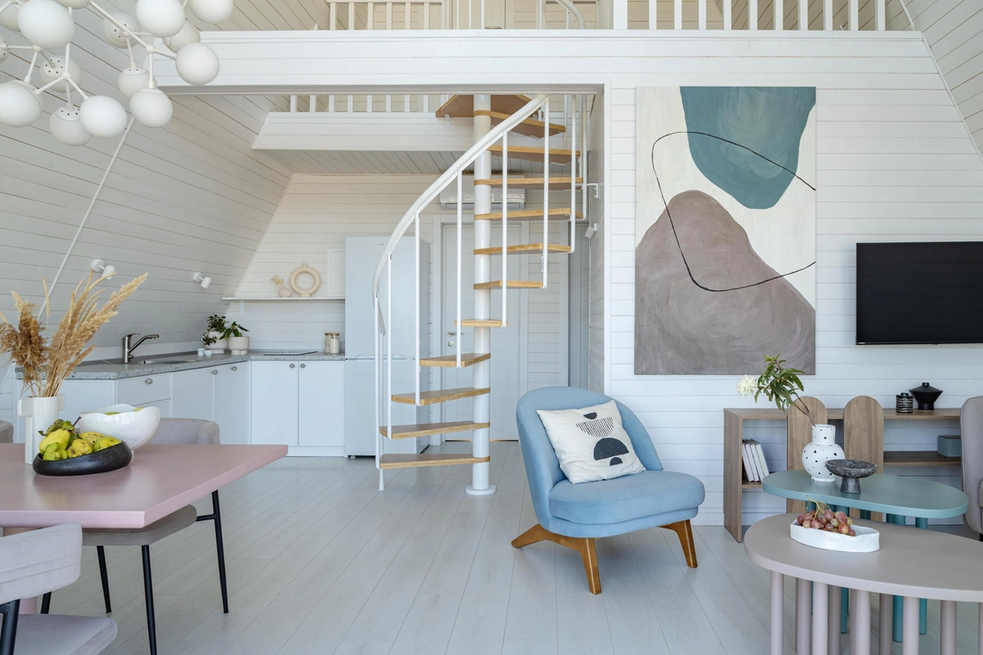 «Заказчик — мой друг и прораб Владимир Янчев, с которым мы реализовали уже не один совместный проект. Он рассказал, что хочет построить деревянный дом „А-фрейм“ под сдачу в аренду. Пространство для тех, кто предпочитает уединенный отдых вдали от шума и суеты, — рассказывает Александра Мужчинина. — Я давно мечтала оформить мини-гостиницу с небольшим бюджетом и вызвалась помочь. В итоге так увлеклась, что мы вместе спланировали не только дом, но всю территорию участка. Я сама сажала лаванду и злаковые травы вдоль забора и даже помогала этот забор красить. Приезжала сюда работать и следить за ходом строительства, но на самом деле скорее отдохнуть от города и, как говорят, заземлиться».