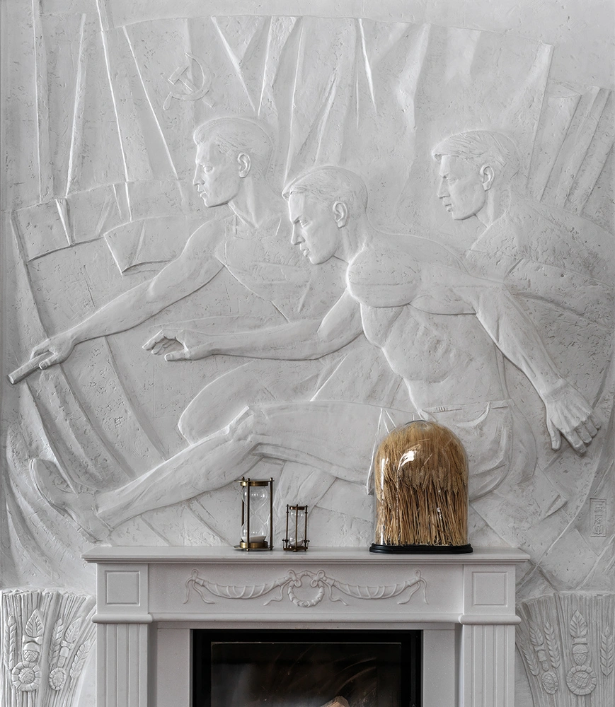 И, наконец, главный аккорд! «В каждом проекте нашей студии есть предмет, который делает интерьер запоминающимся. Здесь это барельеф на тему советского спорта. Его воплощение заняло почти год, а вдохновением послужила выставка „Оттепель“ и художники Сурового стиля».