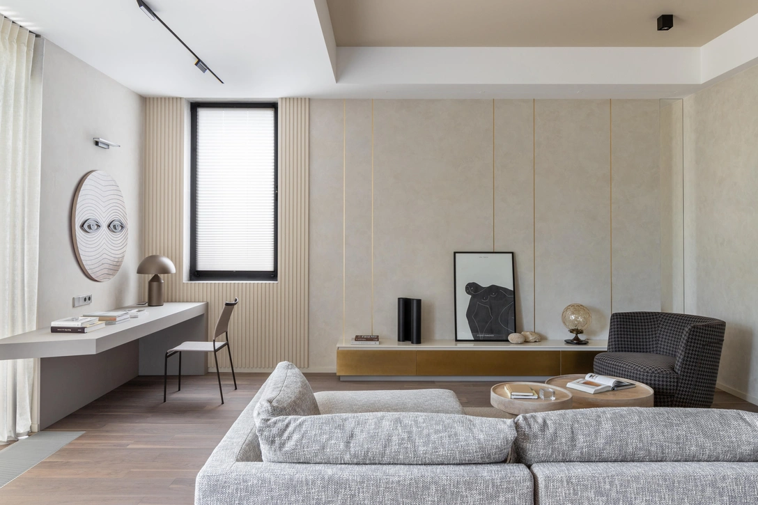 Основное пространство выполнено в песочных тонах, которые отсылают к морскому побережью. Общую тональность разбавляют темные элементы мебели и черная фурнитура, напоминая камешки разбросанные по пляжу. Вертикаль задают латунные вставки в декоративной штукатурке, гипсовые панели и складки портьер. «Материалы заказчица выбирала, основываясь на своих тактильных ощущениях. Мы все трогали и щупали. Благодаря этому даже с закрытыми глазами можно прочувствовать теплую атмосферу, царящую в доме».