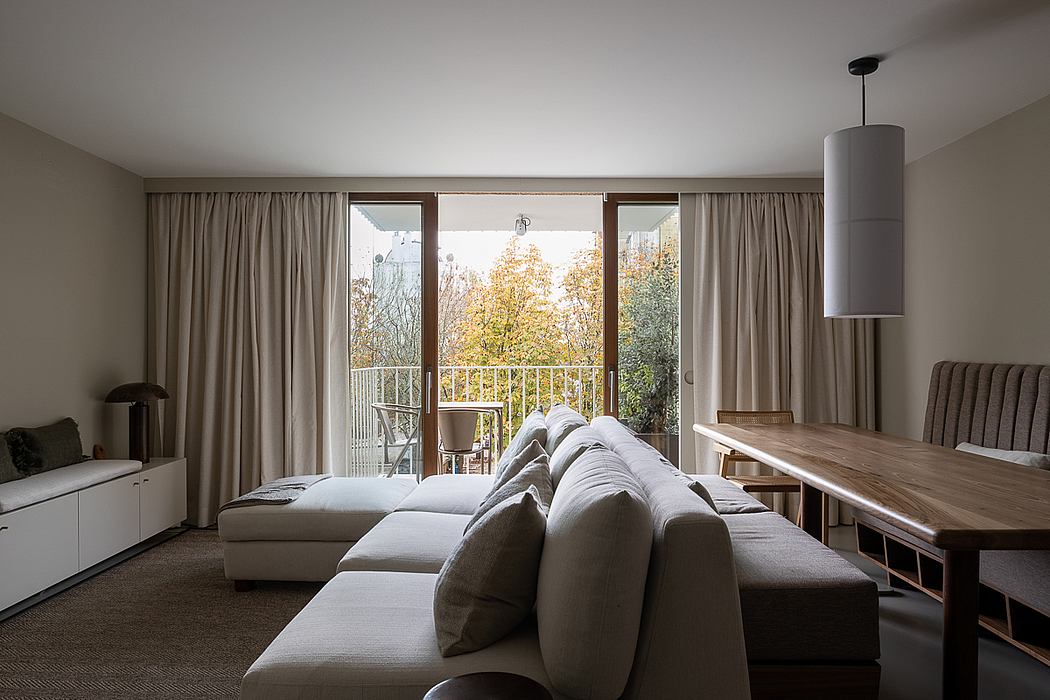 Графичная лестница, соединяющая три этажа, спроектирована таким образом, чтобы подчеркивать вертикаль здания. В самом низу расположены две небольшие гостиные с выходом на террасу и в частный сад. Выше — объединенное пространство кухни-гостиной и веранда, ориентированная на юг — так, чтобы большую часть дня сюда попадал солнечный свет, а обитатели могли любоваться видом на парк Тапада-Ажуда.