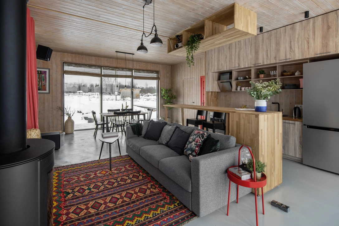 «Создавая интерьер я в первую очередь ориентировалась на дизайн подобных домов в Дании, Финляндии и Норвегии. Мне хотелось создать отшельническое место с лаконичным интерьером, наполненным натуральными материалами. В отделке стен, потолков и дверей мы использовали однотонную местную сосну. Натуральный оттенок древесины оттеняет ярко-красные акценты в виде дверных проемов, штор и покрывал. Облик интерьера завершают иранский ковер и подушки с этническими орнаментами».