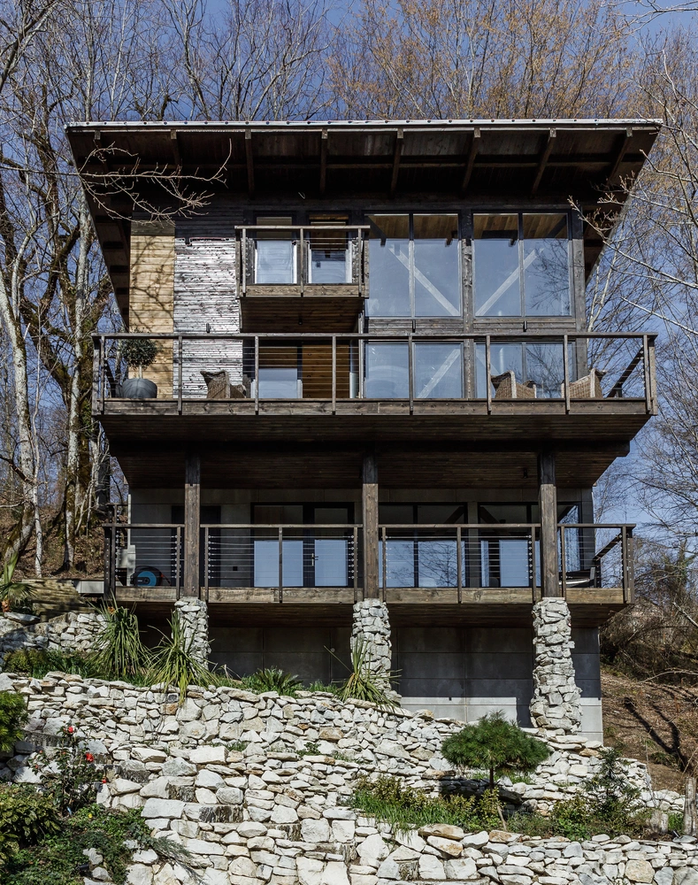 Семья с тремя детьми и одной кошкой давно мечтала построить себе домик в горах под Сочи, чтобы со временем переехать в него «на пенсию», а до этого приезжать на каникулы. Тем более, что и к соседям привыкать не придется — поблизости уже поселились близкие друзья семьи из их родного Нижнего Новгорода. Оттуда же родом и автор проекта — дизайнер Жанна Наволоцкая.
