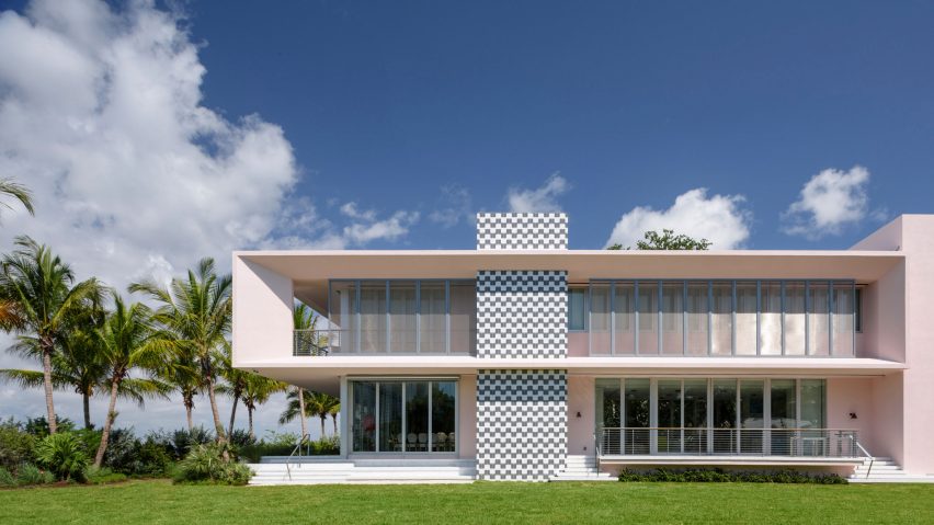 Двухэтажная вилла в нежно-розовом цвете построена в форме буквы L. Между двумя крылами разместился уединенный двор с пышной тропической растительностью и скульптурами. «Вдоль короткой стороны с видом на залив и сад находятся жилые комнаты хозяев, а вдоль длинной — различные подсобные помещения», — рассказывает архитектор Алан Шульман (Allan Shulman) из бюро Shulman + Associates.