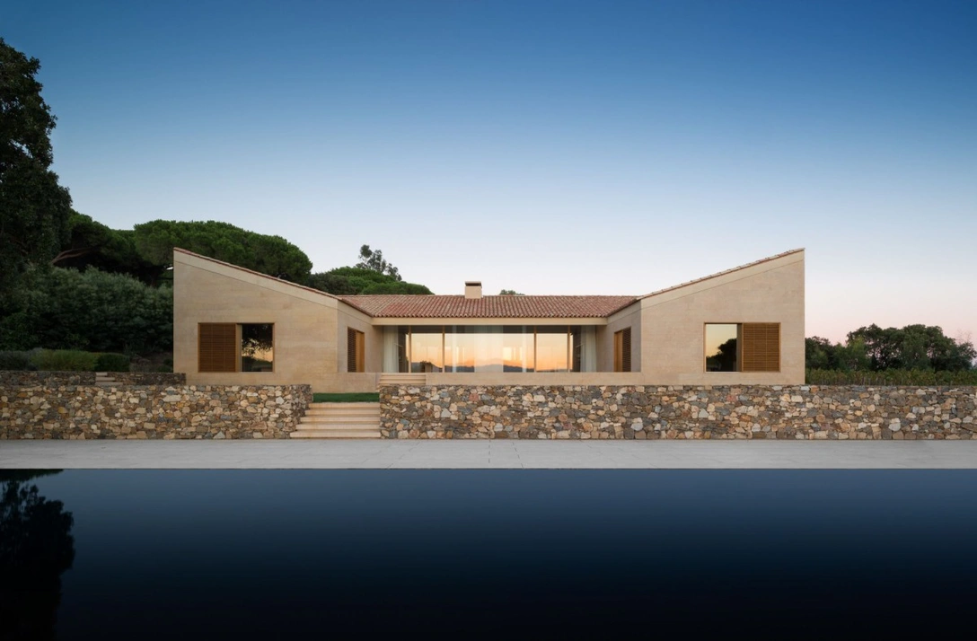 Вилла, спроектированная архитектором Джоном Поусоном (John Pawson), находится в закрытом поселке Ле-Парк-де-Сен-Тропе в окружении сосен, виноградников и пробковых дубов. Главный дом состоит из центрального пространства, которое занимает основная общественная зона, и двух боковых крыльев, где располагаются спальни, подсобные помещения и библиотека с видом на виноградник. Кубическая форма здания и наклонные плоскости крыши, с одной стороны, перекликаются с местной архитектурой, а с другой, — придают ему современный вид.