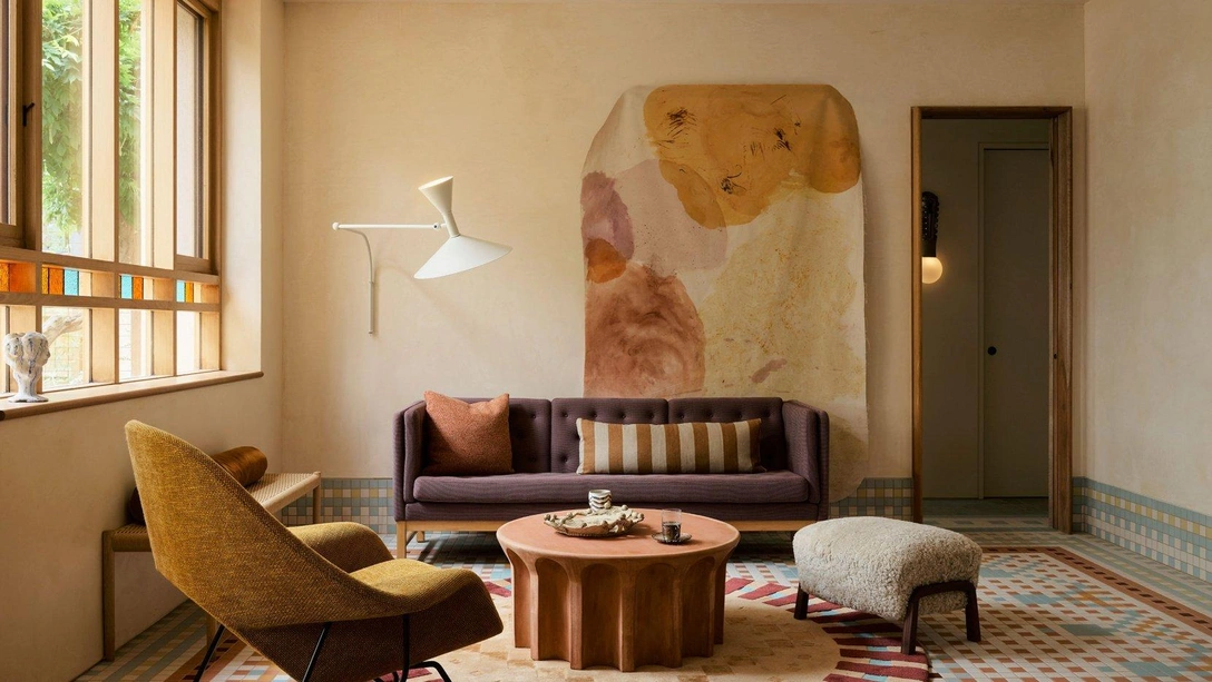 Диван EJ315, дизайн Эрика Уле Йоргенсена. Пуф Wulff, &Tradition; На стене картина Джанне Паско-Уайт «Embodied Watery Entanglements 16» (2022). Керамика Минаал Лоун.