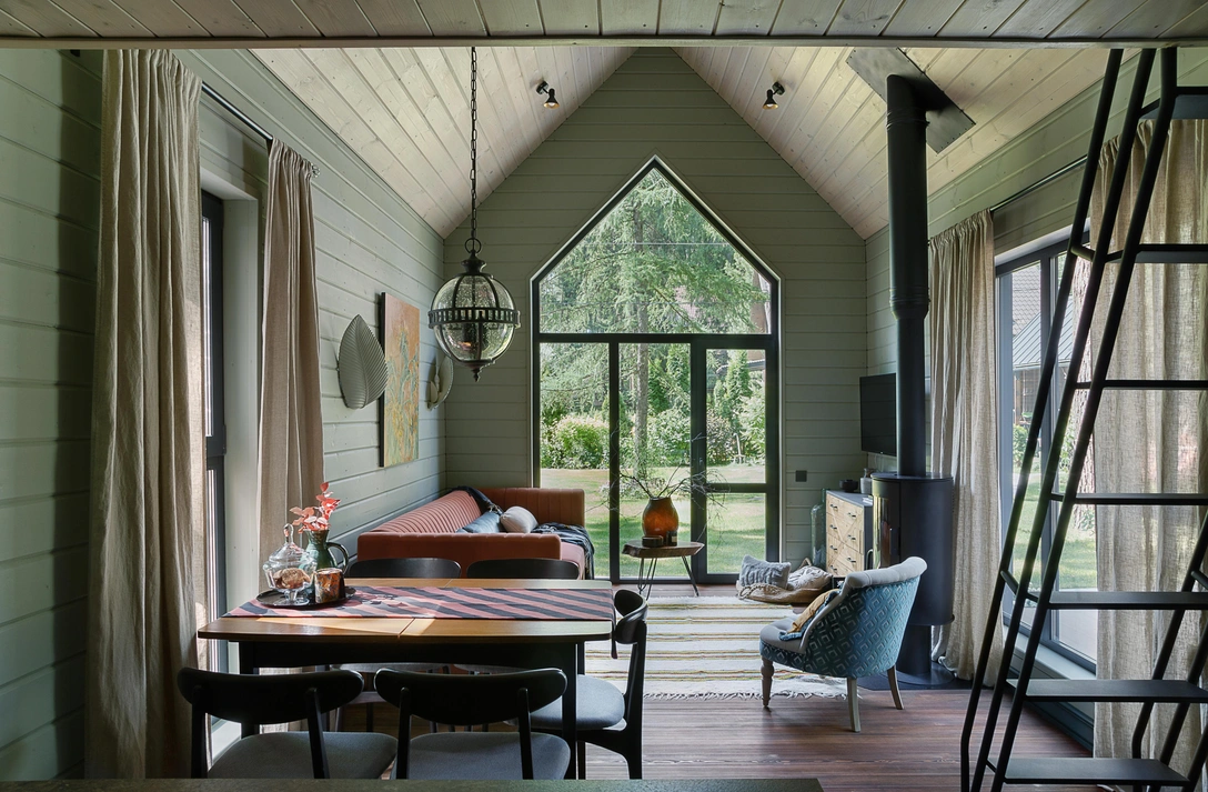 Дом очень компактный. Я организовала две небольшие спальни, детскую, расположившуюся на антресоли, и кухню-гостиную с вторым светом. Также я сделала ванную комнату с окном в пол, с чем моим близким не просто было смириться — они до сих пор наглухо задергивают шторы. Но я очень рада, что семья дала мне полную свободу действий и, даже когда кого-то смущал мой выбор, никто не возражал, и все ждали окончания ремонта, чтобы увидеть интерьер целиком.