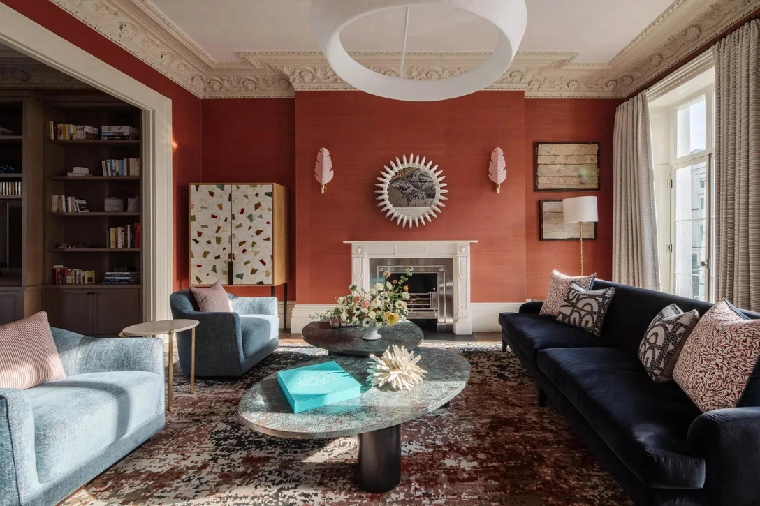 Ярким «пятном» в доме стала гостиная, оформленная терракотовыми обоями. Этот цвет был навеян кирпичными зданиями Лондона. На его фоне особенно эффектно смотрятся предметы искусства из коллекции заказчиков.