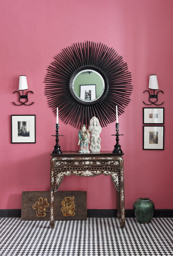 Яркий, дерзкий оттенок гостиной служит объединяющим началом: в тот же цвет выкрашена стена над лестницей и коридоры. Однако, по мнению Бруно, полностью монохромный интерьер — это скучно, поэтому для ограждения лестницы, дверных коробок и самих дверей дизайнер выбрал благородный оттенок серого. После этого он продолжил действовать под девизом: «Каждой комнате — свой цвет!» На нижнем этаже царит розовый оттенок лотоса, в одной из спален — золотисто-желтый, в малой гостиной — насыщенный оранжевый. Даже табуретки выкрашены в цвета апельсина и розовых лепестков.