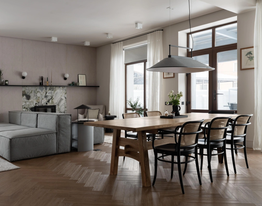 «Этот проект создавался для молодой семьи предпринимателей с двумя детьми. Раньше заказчики жили в городской квартире. Это их первый дом, поэтому им хотелось реализовать все мечты, от камина до большого дубового стола. Главной задачей было создать интерьер вне времени — теплый, уютный, наполненный природными фактурами и предметами ручной работы», — рассказывает дизайнер Алиса Копылова.