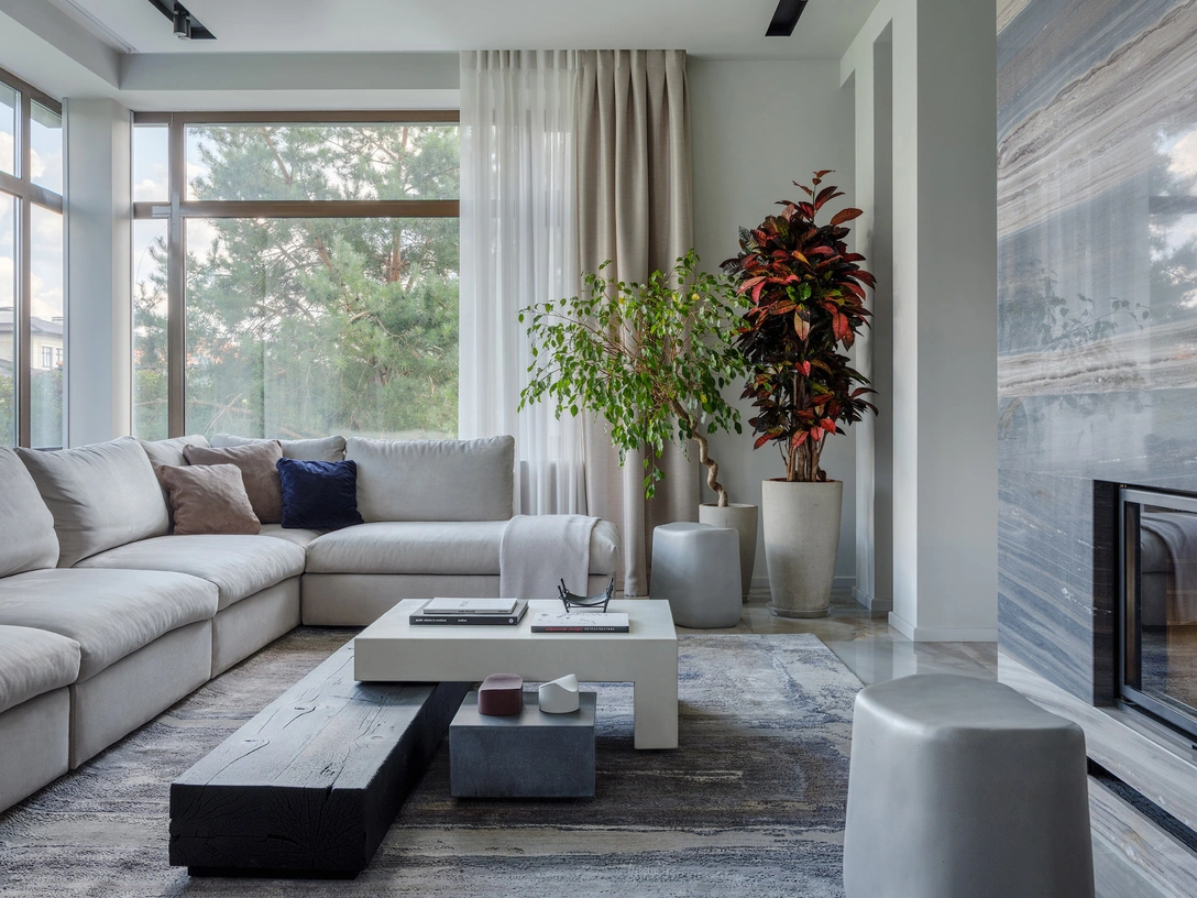 В гостиной притягивает взгляд роскошный дровяной камин, любоваться которым можно и из столовой. «Дымоход облицован натуральным камнем — это мрамор Palissandro Bronze с очень красивым неповторимым природным рисунком, — рассказывает Юлия. — Мы долго охотились за ним. Интересно, что один элемент журнального столика в гостиной сделан из темной обугленной древесины — таким образом мы провели параллель с камином».