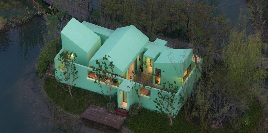 Китайское архитектурное бюро Wiki World спроектировало необычный зеленый дом Oasis Cabin, который расположен в культурно-туристическом комплексе Ganlushan Culture Creativity City. Светло-зеленая конструкция органично вписывается в местный ландшафт. Сюда можно добраться на лодке — у дома есть свой причал. С другими островками он соединяется с помощью моста. Здесь можно наслаждаться спокойной и уединенной, «замедленной» жизнью.