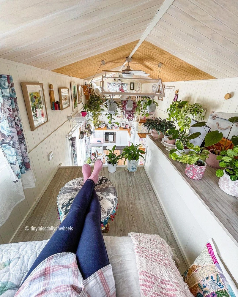 В доме открытая планировка, что позволяет визуально увеличить маленькое пространство. Над кухней расположена антресоль с зоной для сна, там Долли смогла разместить большой матрас и навести уют с помощью мягких подушек, атмосферной подсветки и горшков с цветами. Через мансардное окно в спальню попадает свет. А еще через него можно любоваться ночью звездами!