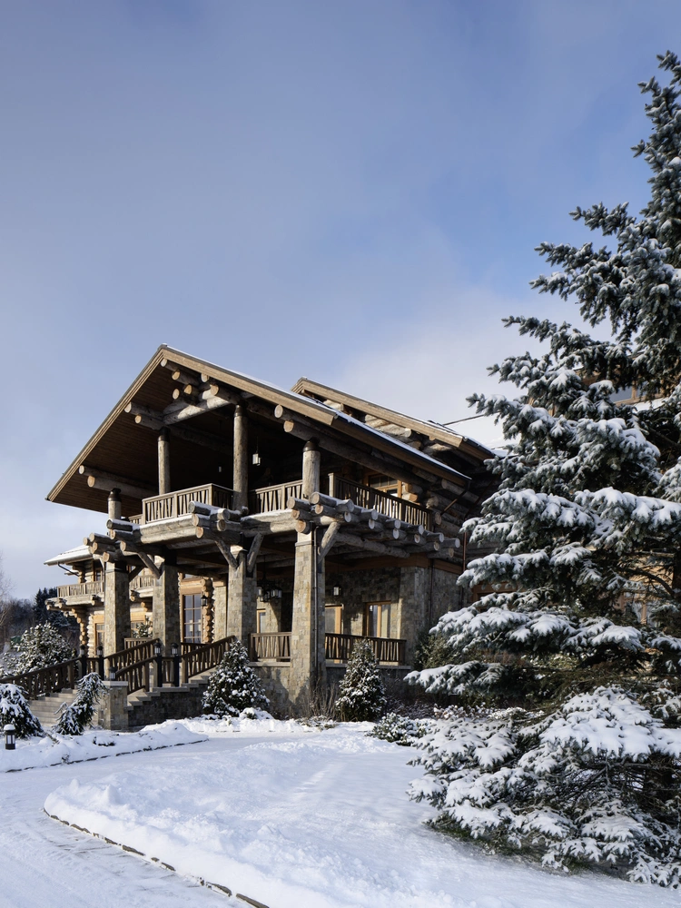 Припорошенный снегом высокий деревянный дом, построенный в живописном месте прямо на берегу Волги, охраняют стройные и высокие ели. Сквозь их пушистые лапы, освещенные солнцем, просматриваются седые сосновые бревна, большие окна, широкое крыльцо — глядя на это, невольно вспоминаются все русские сказки вместе взятые. «Дом задумывался как настоящее семейное поместье вдалеке от городской суеты», — рассказывает автор проекта, архитектор и дизайнер Ольга Зубова.