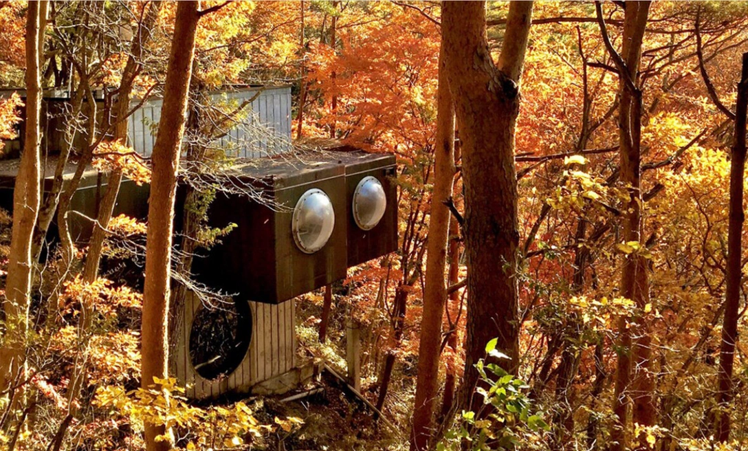 Дом-капсула состоит из центрального ядра и четырех пристроенных комнат-модулей. На первом этаже находится гостиная и чайная комната, а на втором этаже — спальни и кухня. Фасады капсулы обшиты листами кортеновской стали и дополнены куполообразными окнами, из которых открывается вид на лес.