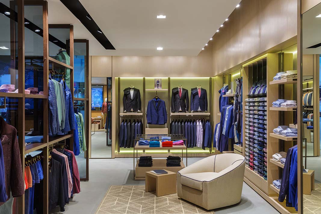ЛИНО ЛОЗАННО: Мы разделили магазин на две зоны: зал сasual и классическую часть. На самом деле, это деление условно, потому что образ от Meucci - это тонкое переплетение классики и новых тенденций. В левой части магазина, скажем так, можно увидеть больше классических рубашек и галстуков. И она выглядит чуть более традиционно. Зал сasual оформлен в духе 1950х годов. Декор чем-то напоминает оформление библиотеки середины XX века. Продумывая интерьер, мы вдохновлялись обстановкой старых итальянских общественных заведений, в частности флорентийских. Слева расположена классическая зона. Здесь больше вертикальных линий, более четкие пропорции. В декоре мы отталкивались от образа классической гардеробной.