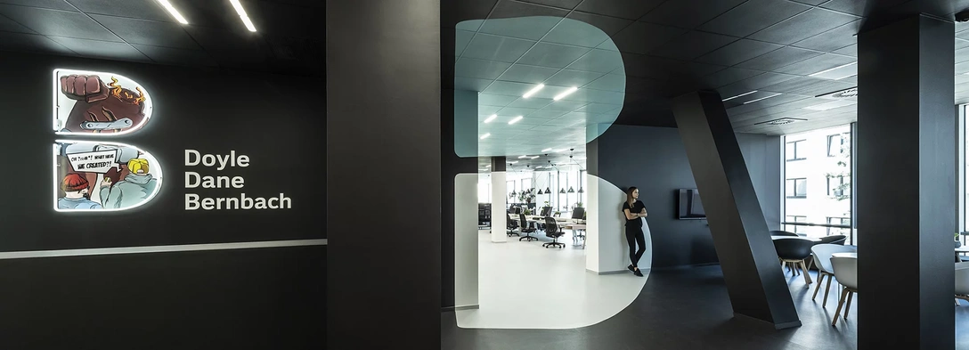 Интерьеры современных офисов — это всегда масса креативных решений и неординарных идей. Не исключение и новое рабочее пространство, созданное для пражского рекламного агентства DDB архитектурным бюро B2 architecture. Прямо у входа, в зоне ресепшн, посетителей встречает огромная буква В, логотип компании в ее фирменных цветах, нарисованная на стенах, полу и потолке. Но если пройти внутрь, оказывается, что это — всего лишь оптическая иллюзия. Буква «расплывается», а белый и мятный распространяются на все помещение офиса.