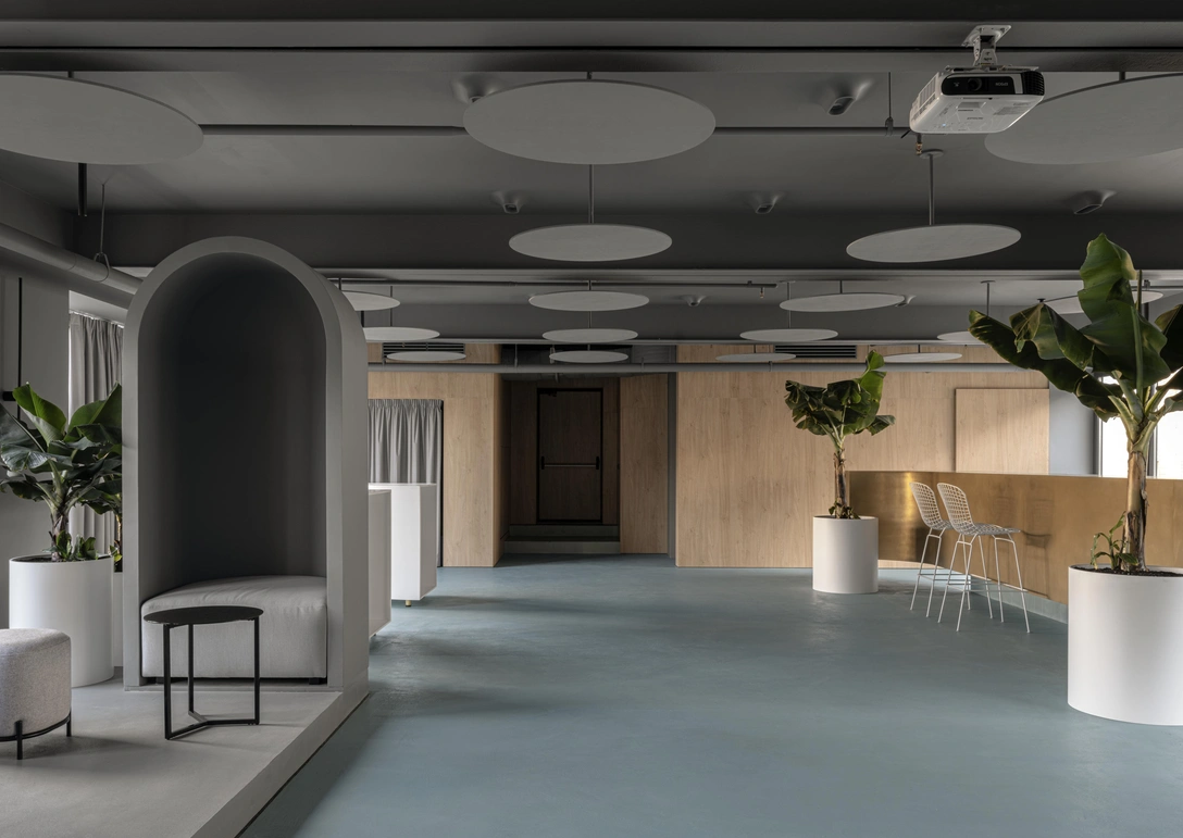 Чтобы адаптировать существующий объем к новой функции архитекторы создали по сути «интерьер в интерьере». И при этом сохранили эффект единого пространства, которое было обозначено в задании на проектирование. Интерьер получился строгим, функциональным, но не без игры с объемами барной стойки, малых архитектурных форм и конструкций.