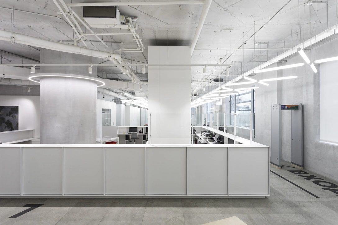 «Все поверхности и элементы интерьера решены в монохромной гамме. Фактуры светлого бетона на полу, стенах и потолке сочетаются со структурными элементами мебели и оборудования, выполненными из белого металлического профиля, сетки и матового стекла, — рассказывают авторы проекта. — Стойки информации и касс сделаны из тонкого окрашенного стального листа. Полупрозрачные перегородки из матового стекла, формирующие отдельные зоны, изготовлены из стального каркаса с характерной и ритмичной вертикальной структурой». www.melspace.ru