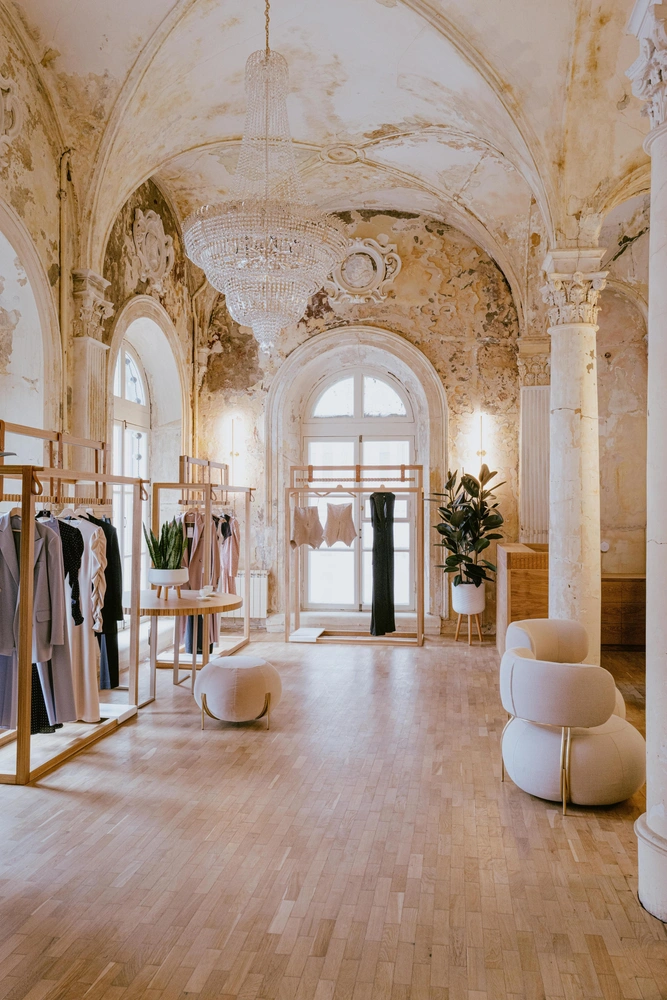«Мы долго размышляли над наполнением этого уникального пространства с двухсотлетней историей. Идея „наложения“ современных элементов интерьера на такой богатый фон оказалась наиболее уместной, более того это соответствовала философии бренда. После продолжительного поиска решения стало очевидным — то новое, что мы хотим внести, должно быть очень лаконичным и сдержанным. Эта идея легла в основу дизайна выставочных рейлов, стойки обслуживания и витрины с зеркалом, которые мы изготавливали на нашем производстве. Для зоны отдыха мы выбрали лаконичные кресла и пуфы».