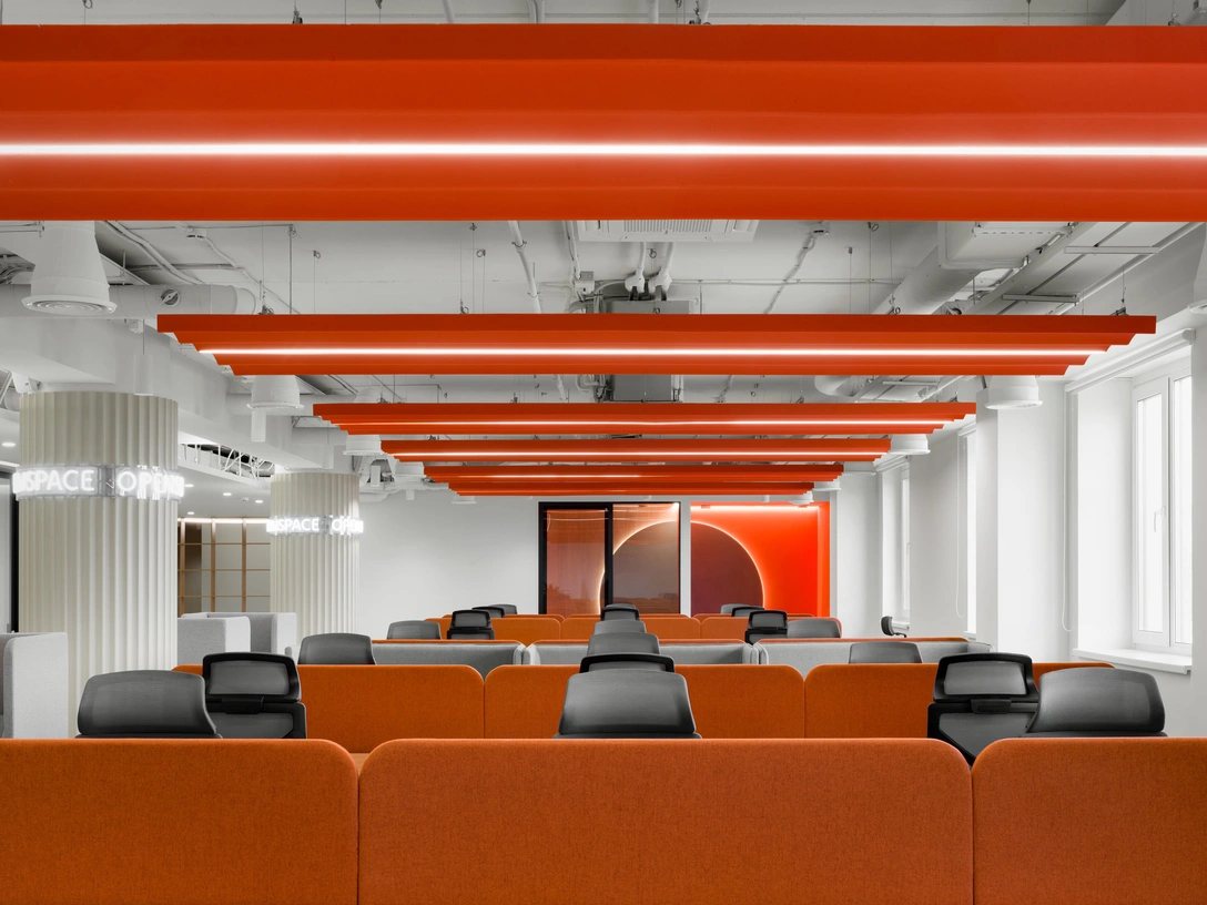 Бюро IND architects модернизировало офис МТС Медиа на Петровском бульваре. Архитекторы не только обновили интерьеры, но и реализовали гибкий формат мест для работы, переговоров и отдыха. В дизайне офиса использованы темы русской архитектуры первой половины XX века. Так орнамент напольного покрытия в сочетании с яркими акцентами (красным, синим, желтым) отсылает к стилистике авангарда. Ее подчеркивают скругленные углы, неоновые надписи и фигурные акустические панели, цвет которых меняется от этажа к этажу.