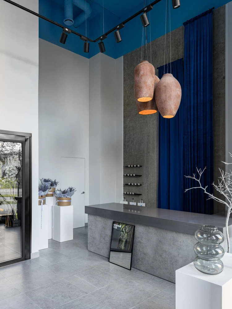 «Синий потолок — основной цвет бренда, он же цвет неба и мечтаний», — говорит дизайнер. Холодильник для цветов сделан на заказ.